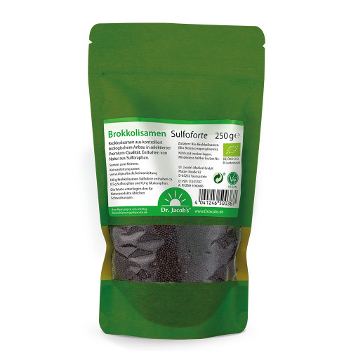 Sulforaphan und Glucoraphan sind sekundäre Pflanzenstoffe, die zur Gruppe der Glucosinolate (Senfölglycoside) gehören. Brokkoli ist eine sehr gute Quelle für Glucosinolate. Diese sind insbesondere in den Samen und Keimlingen enthalten. Der Gehalt ist bei gegartem Gemüse stark vermindert, da die Verbindungen hitzeempfindlich und wasserlöslich sind. Unerhitzte Brokkolisamen sind daher eine gute Alternative. Damit die in den Brokkolisamen enthaltenen Senfölglycoside vom Körper aufgenommen werden können, müssen sie vor dem Verzehr aufgeschlossen werden. Möglichkeiten hierfür sind beispielsweise das Mahlen/Zerstoßen der Samen oder Keimen.