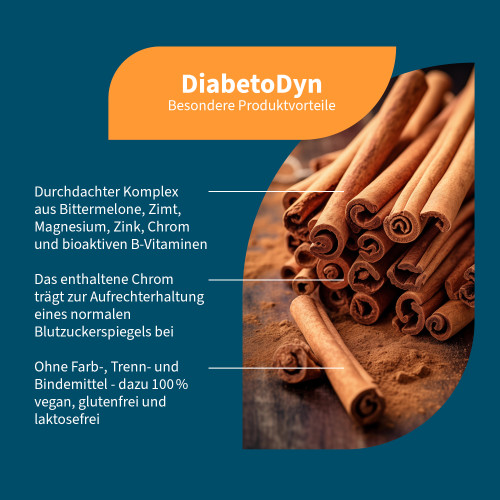 Bittermelonen-Extrakt, Zimt-Extrakt, Überzugsmittel: Hydroxypropylmethylcellulose (HPMC); Magnesiumcitrat, Magnesiumbisglycinat, Magnesiummalat, Zinkgluconat, Pyridoxal-5-Phosphat, Thiaminhydrochlorid, Chrompicolinat, Hydroxycobalamin, Adenosylcobalamin, Methylcobalamin.