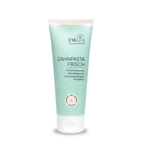 mit Xylit, EM-Antioxidantien und EM-Keramikpulver. Mit Kamillen- und Hamamelis-Extrakt, erfrischendem und belebendem Minzöl und den regenerierenden Bachblüten Holzapfel, Eiche und Olive. Ohne Fluor, ohne SLS