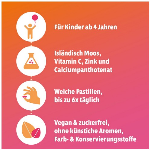 1 Pastille enthält 80 mg wässrigen Auszug aus Isländisch Moos (0,4 - 0,8 : 1). Weitere Bestandteile: Arabisches Gummi, Sorbitol, Maltitol, Steviolglykoside, Ascorbinsäure (Vitamin C), Calciumpantothenat, Zinkgluconat, natürliches Aroma, färbender Pflanzenextrakt (Karotte / schwarze Johannisbeere), mittelkettige Triglyceride, gereinigtes Wasser. 1 Pastille enthält die Zuckeraustauschstoffe Sorbitol (0,312 g) und Maltitol (0,685 g) = 0,083 BE.