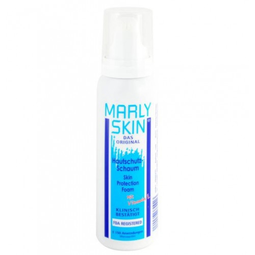 Neben dem normalen Hautstress durch umwelteinflüsse wird der natürliche Säure- und Fettmantel der Haut durch eine Vielzahl von agressiven Schad- und Reizstoffen beeinträchtigt und zerstört. Das führt zu unangenehmen Hautirritationen bis hin zu allergischen Reaktionen. MARLY SKIN® ist ein professioneller Hautschutzschaum, der sowohl vor wässrigen als auch organischen Substanzen schützt. Die Haut wird zuverlässig über vier Stunden vor Schad- und Reizstoffen geschützt. Bewährt hat sich MARLY SKIN® auch in der Altershygiene, insbesondere bei Dekubitus, Inkontinenz und Diabetes.