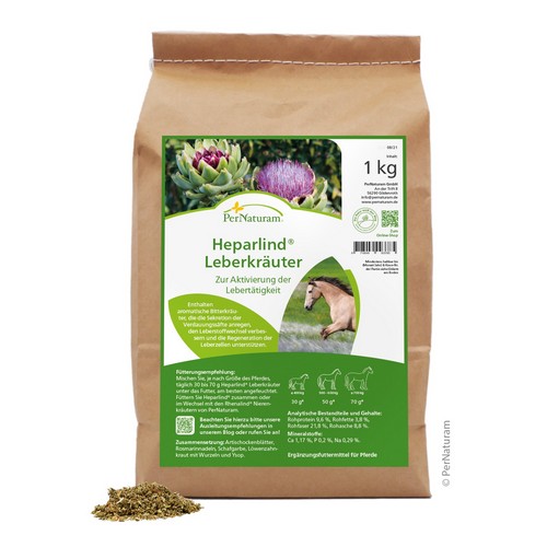 Mischen Sie, je nach Größe des Pferdes, täglich 30 bis 70 g Heparlind Leberkräuter unter das Futter, am besten angefeuchtet. Füttern Sie Heparlind zusammen oder im Wechsel mit den Rhenalind Nierenkräutern von PerNaturam. Durch die Blatthaare der Kräuter können sich durch Transportbewegungen beim Versand Faserwolken und Fäden bilden. Dies ist natürlich und stellt keine Qualitätsminderung dar.